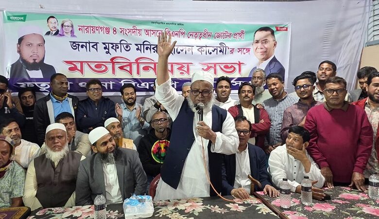 নারায়ণগঞ্জ-৪ আসনে বিএনপি নেতৃত্বাধীন জোটের প্রার্থী মুফতি মনির হোসাইন কাসেমী বলেছেন, আমি বিএনপির প্রার্থী, জমিয়তে ইসলামের প্রার্থী। বিএনপি আমাকে মনোনয়ন দিয়েছে। এখানে ধানের শীষ ও খেজুর গাছ একাকার। খেজুর গাছের মধ্যেই ধানের শীষ খুঁজে নিতে হবে।